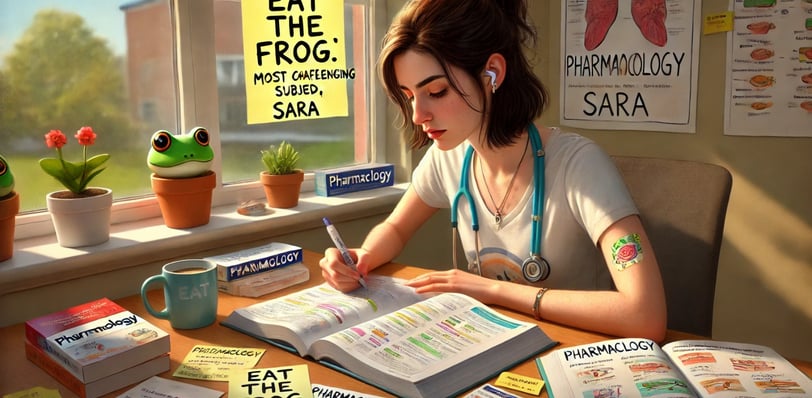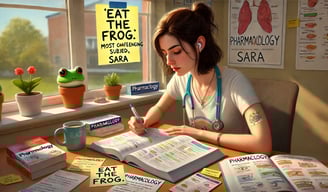 As per the Eat the Frog technique, Sara committed to tackling the most difficult or dreaded task first thing in the morning when her energy and focus were highest. She had been avoiding pharmacology, which always seemed like an endless sea of drug names and mechanisms, but she knew she needed to confront it head-on.